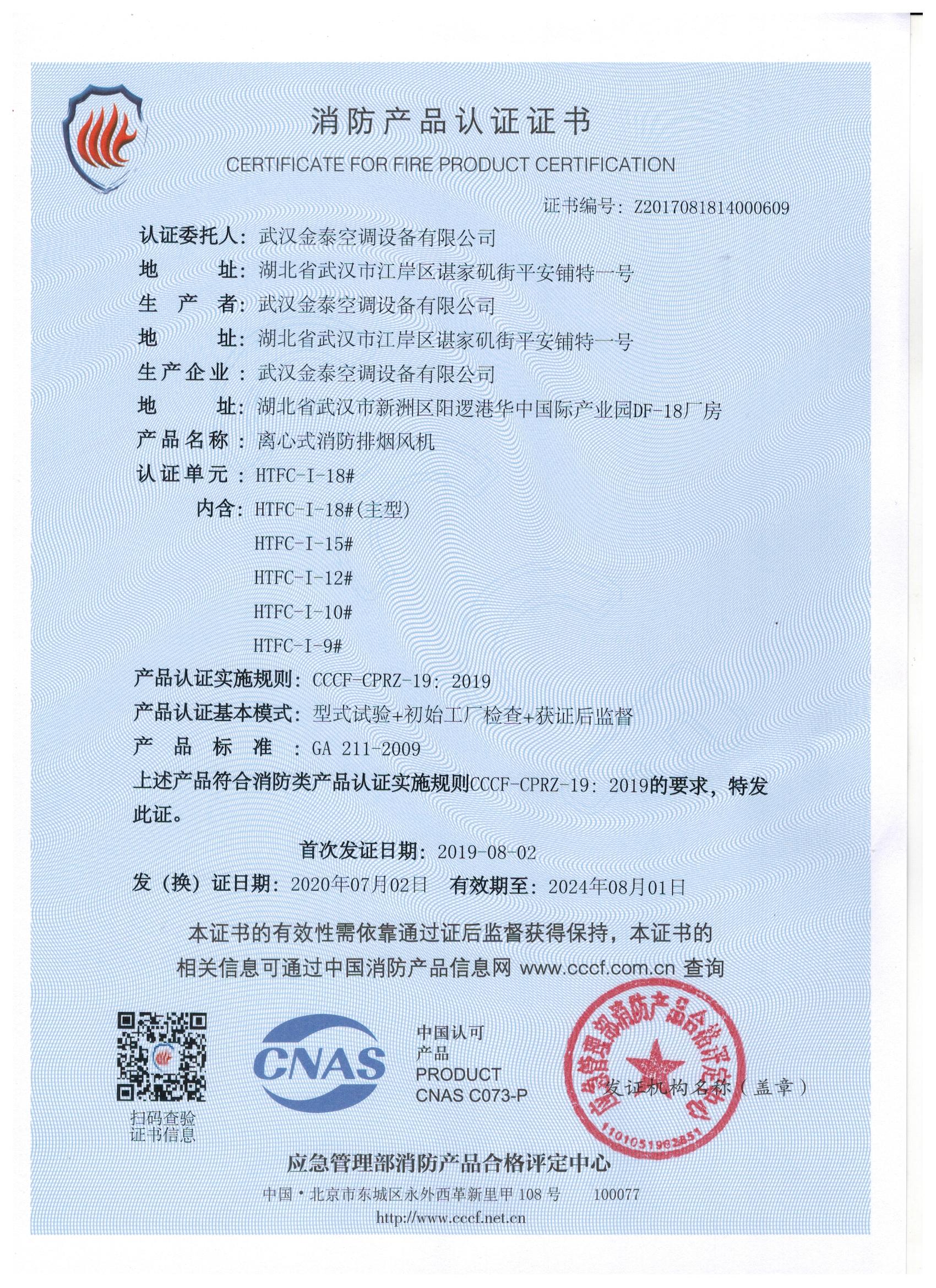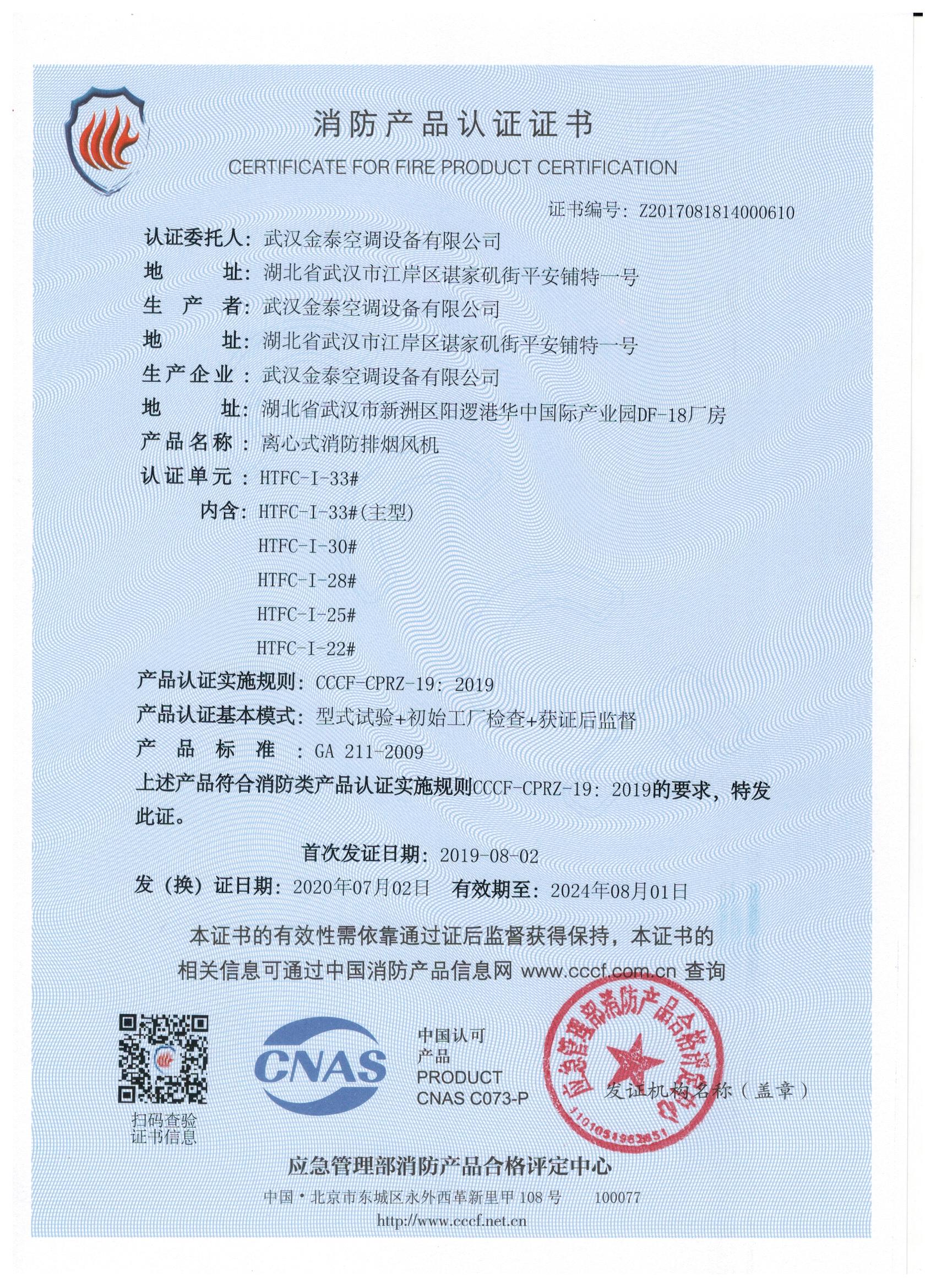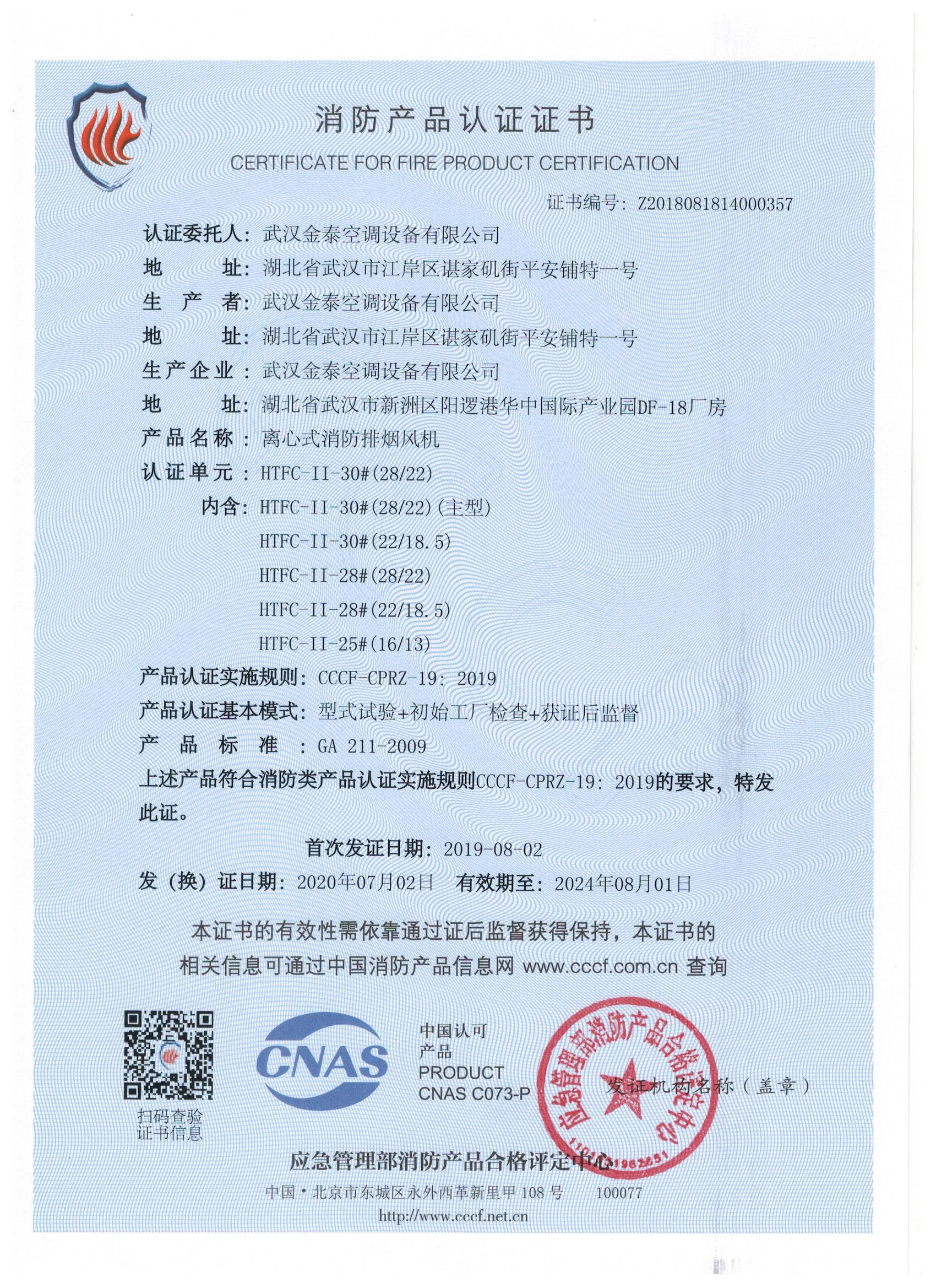 武漢金泰空調設備有限公司 是國內長期專注于民用風機、工業(yè)風機領域的標桿企業(yè):專業(yè)生產消防排煙風機系列、排煙防火閥系列、一般通風機系列(軸流式、離心式、屋頂式、壁式、隧道式、射流式)、風口、風管等消防及通風設備。產品經公安部消防產品合格評定中心評定符合消防產品CCC標準;經中國合格評定國家認可委員會認證的檢驗所檢驗合格;經國家防火建材質量監(jiān)督檢驗中心(四川中心)火燒實驗,耐火性能達標。